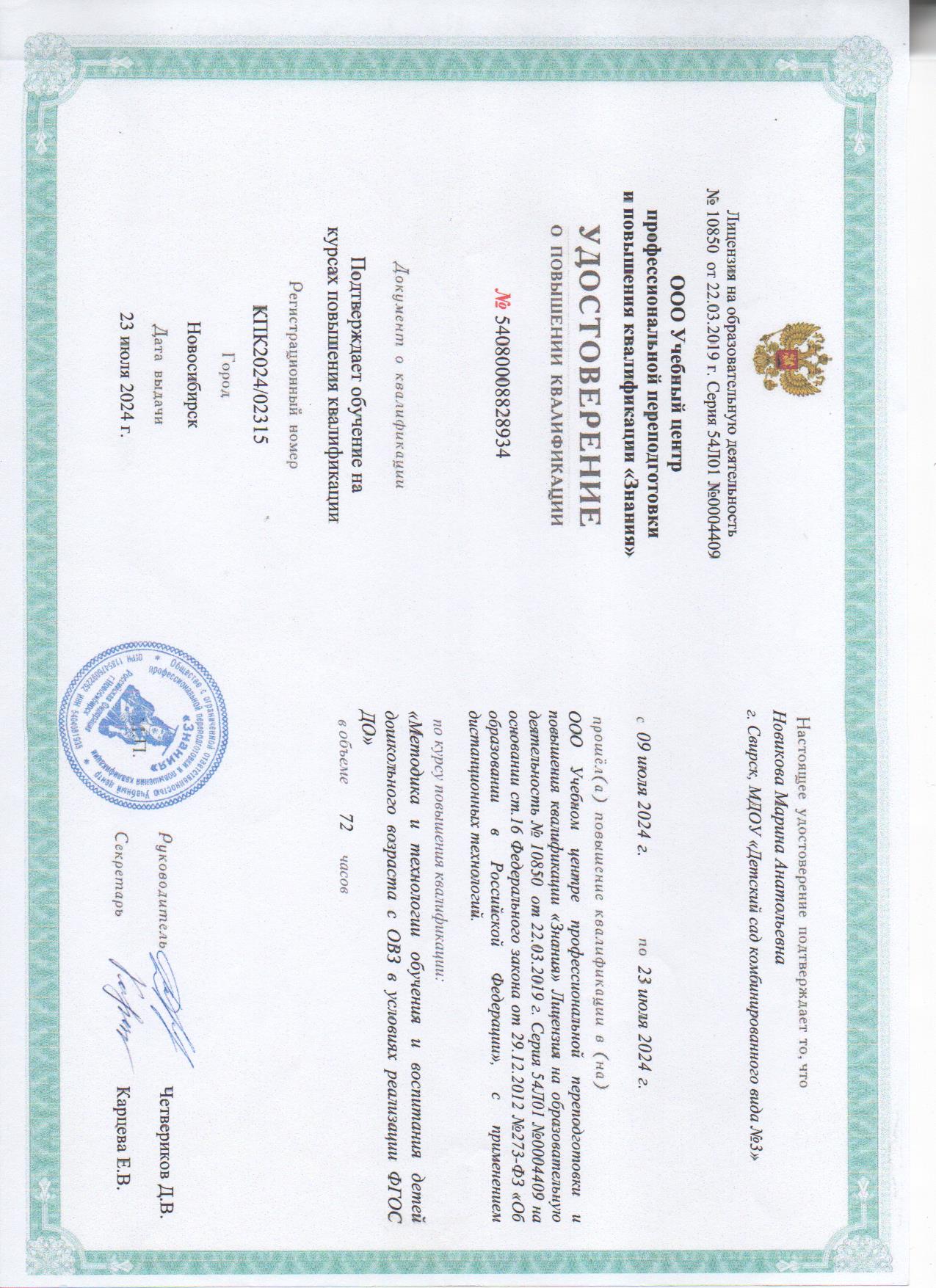 Удостоверение КПК "Методика и технологии обучения и воспитания детей дошкольного возраста сОВЗ вусловиях реализации ФГОС ДО