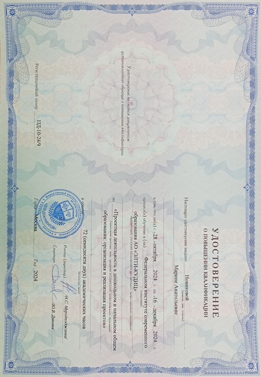 Удостоверение КПК "Проектная деятельность в дошкольном и начальном общем образовании"