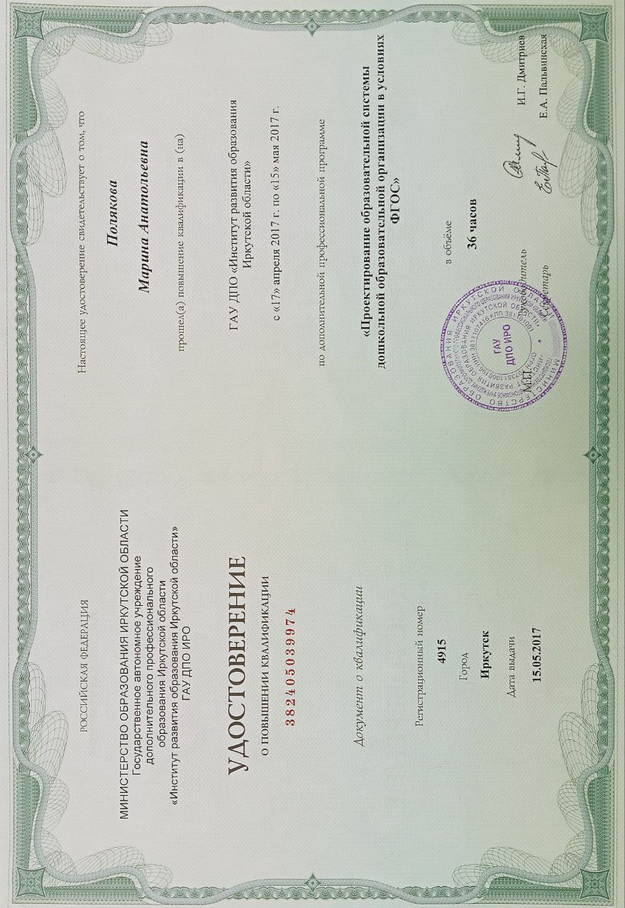 Удостоверение КПК "Проектирование образовательной системы ДОО с условиях ФГОС ДО"