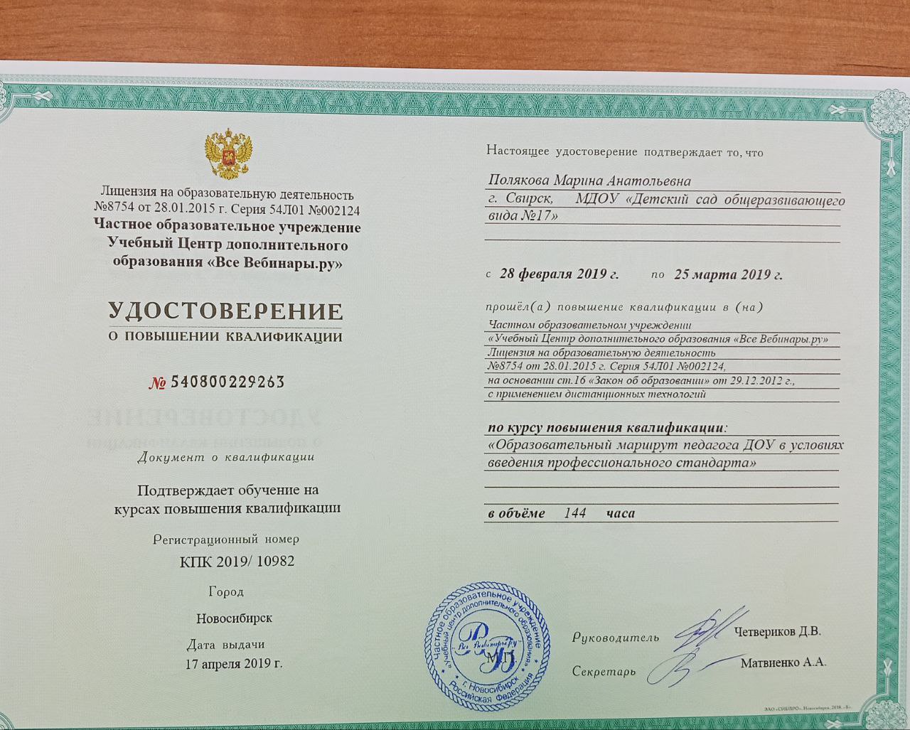 Удостоверение КПК "Образовательный маршрут педагога в условиях введения профессионального стандарта"